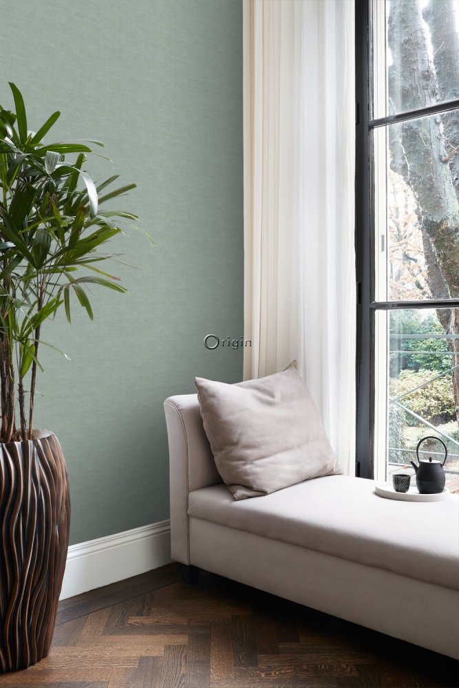 Vliesová tapeta na zeď šedozelená, imitace látky, jemná textura.
