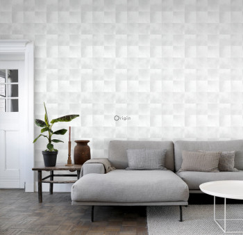 Vliesová tapeta na zeď šedobílá, imitace kožešiny ve čtvercích.