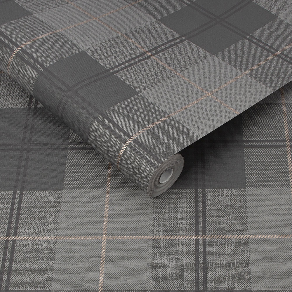 Vliesová tapeta na zeď. Vzor a struktura tweedové tkaniny - odstíny šedé, kovově lesklý zlatý proužek.