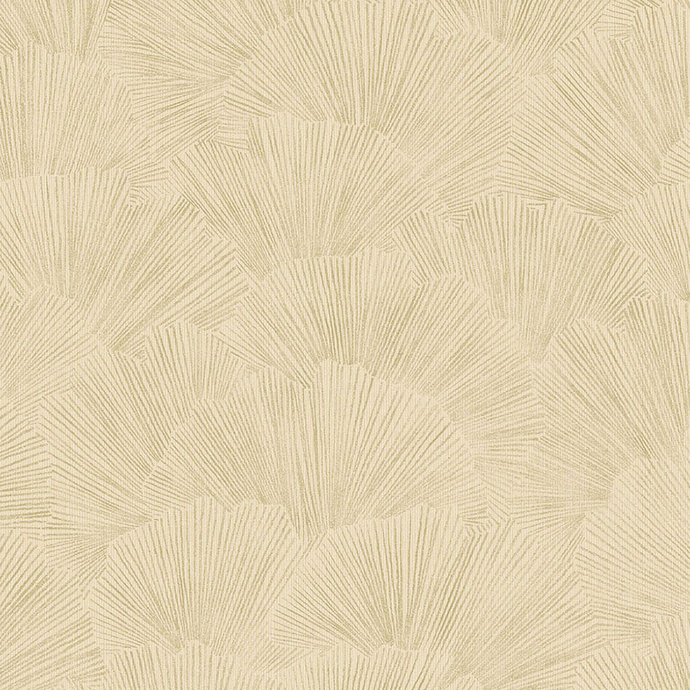 Béžová vliesová tapeta na zeď, zlaté linie tvoří vzor evokující listy Ginkga.