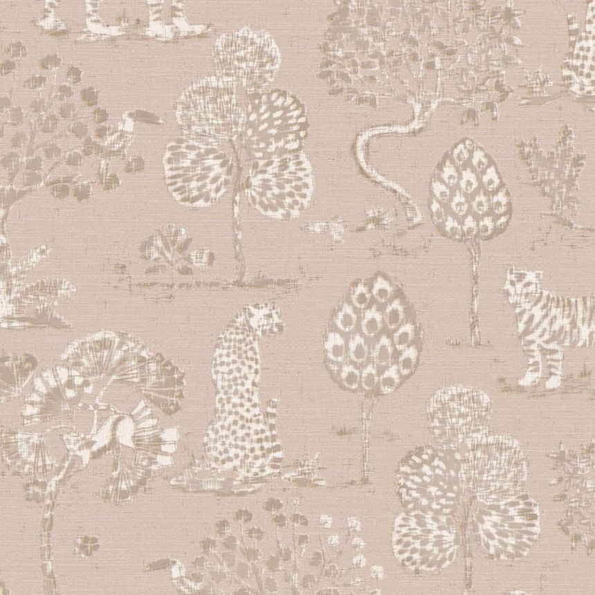 Jemně strukturovaná růžová vliesová tapeta na zeď, motiv stromů, tygrů a leopardů.