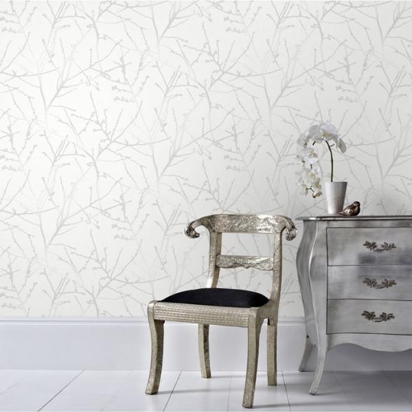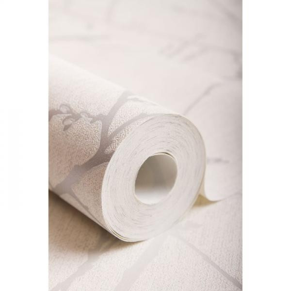 Vliesová tapeta, imitace šedo-bílé látky, prolisované hladké stříbřité větvičky.