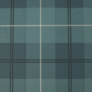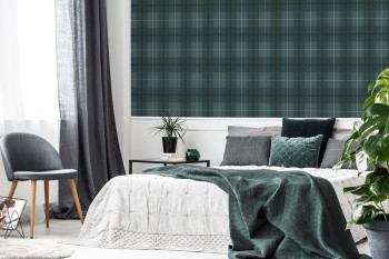 Vliesová tapeta na zeď. Vzor a struktura tweedové tkaniny - odstíny zelené, černý a kovově stříbrný proužek.
