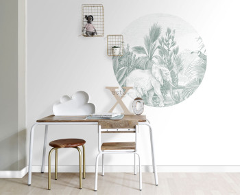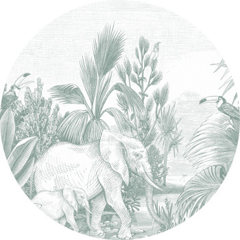 Samolepící kruhová obrazová tapeta na zeď, zelená kresba džungle, slonů, palem.