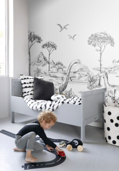 Černobílá obrazová vliesová tapeta s dinosaury.
