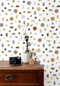 Vliesová tapeta bílá, barevné geometrické tvary.