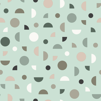 Světlá šedozelená vliesová tapeta na zeď, geometrické tvary v odstínech starorůžové, šedé, hnědé, zelené.