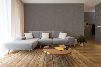 Vliesová, tmavě šedá tapeta. Imitace jemné textilie s odlesky z růžového zlata.