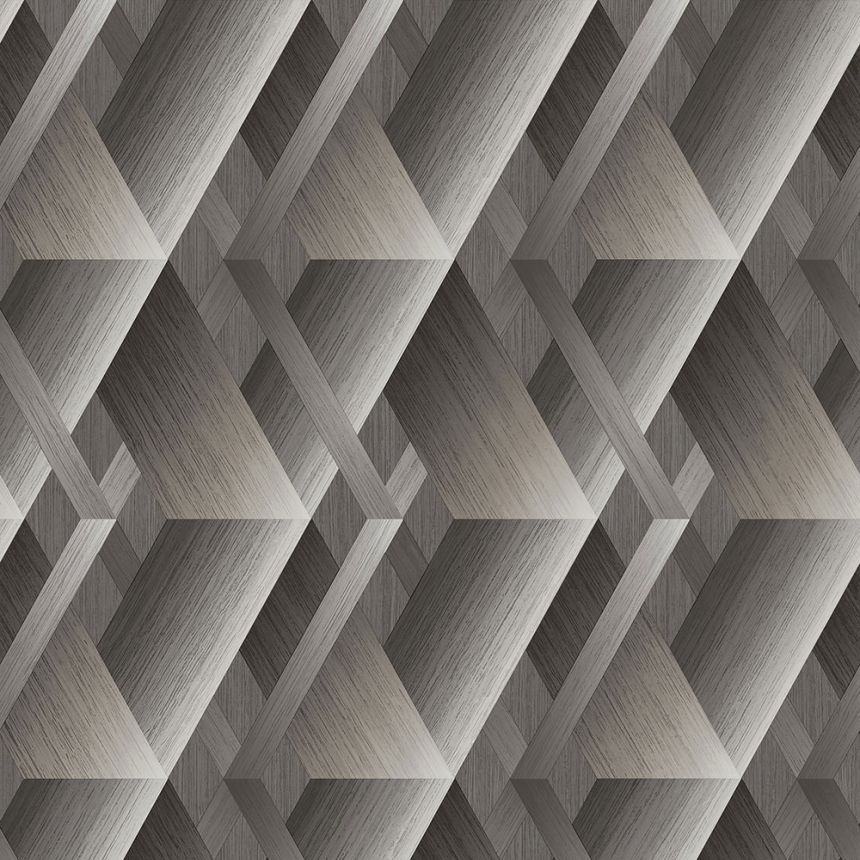 Vliesová geometrická 3D tapeta na zeď, imitace dřeva, odstíny hnědé a šedé.