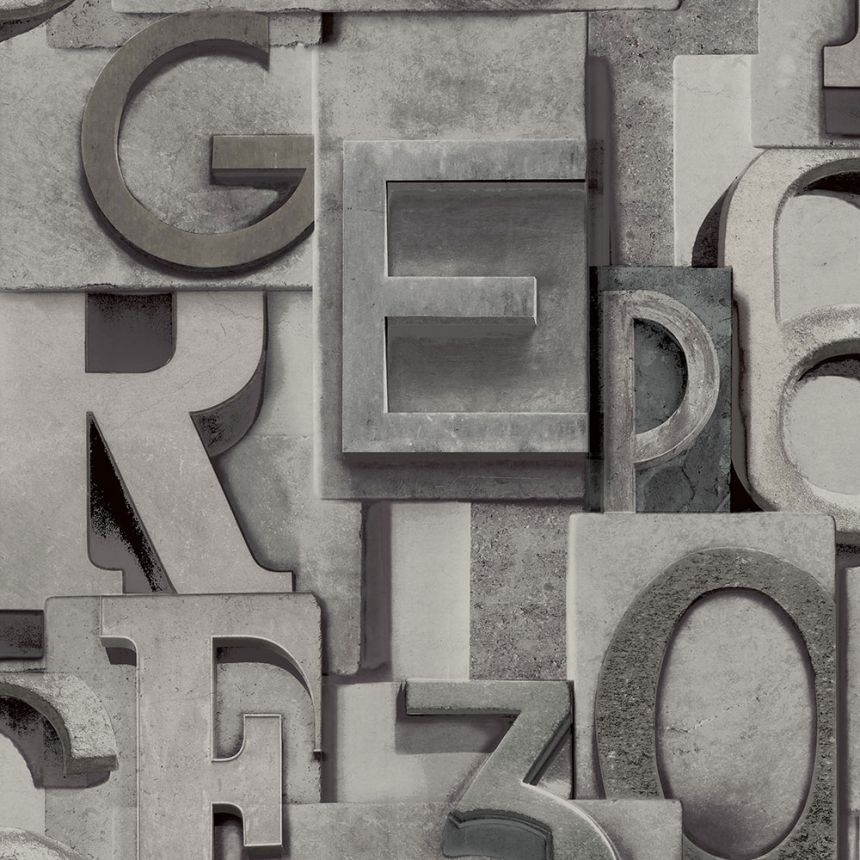 Šedočerná vliesová tapeta na zeď, 3D efekt písmena a číslice.