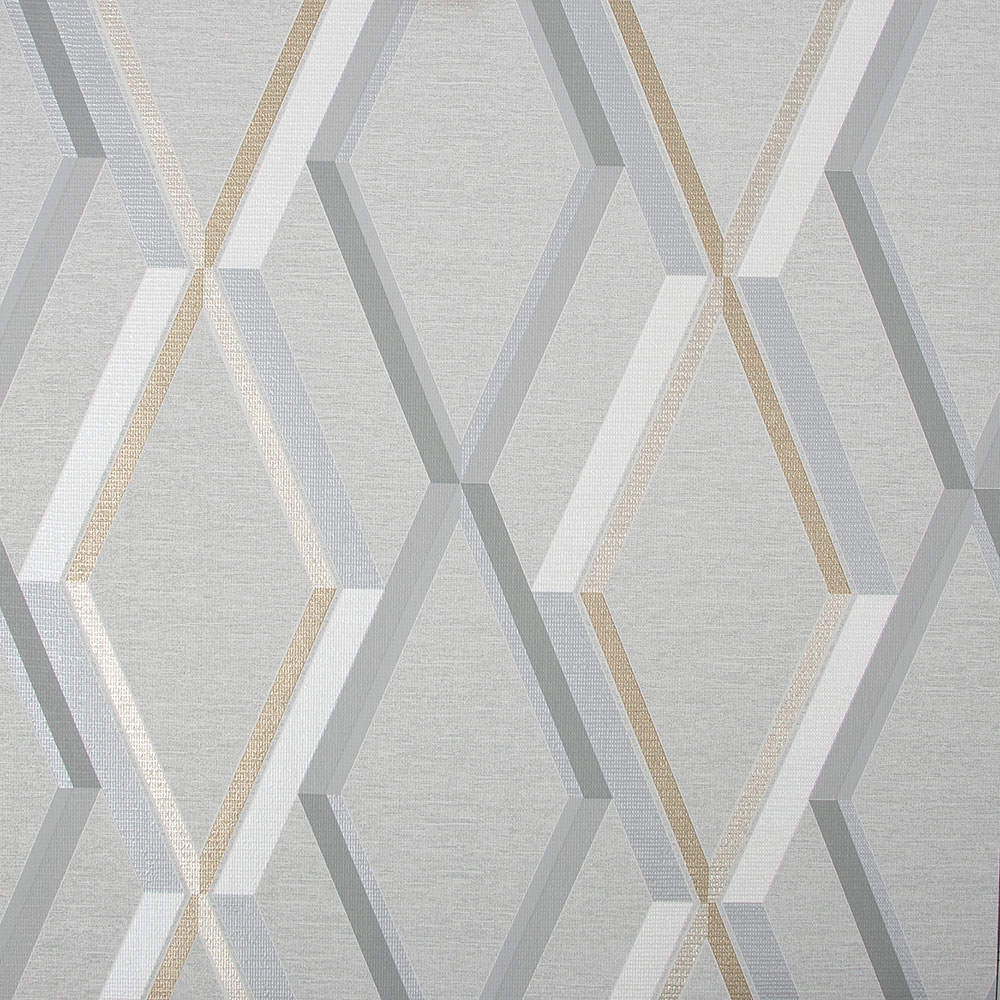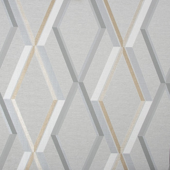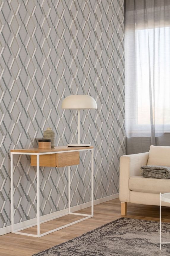 Vliesová tapeta v odstínech šedé, v kombinaci se zlatým metalickým proužkem, s geometrickým vzorem.