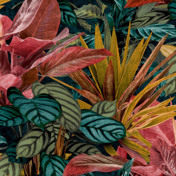 Vliesová tapeta na zeď, vzor tropických listů v odstínech zelené, tyrkysové, růžové a okrové. Tapeta má textilní strukturu.
