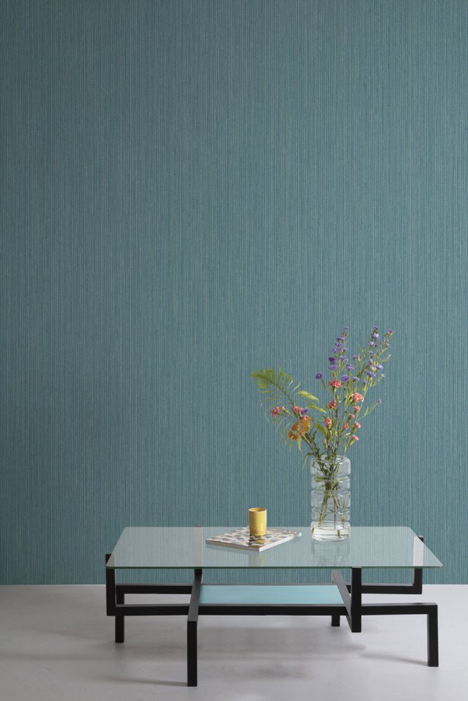 Tyrkysová vliesová tapeta na zeď, jemné stříbrné žíhání. Struktura tapety připomíná strukturu dřeva.