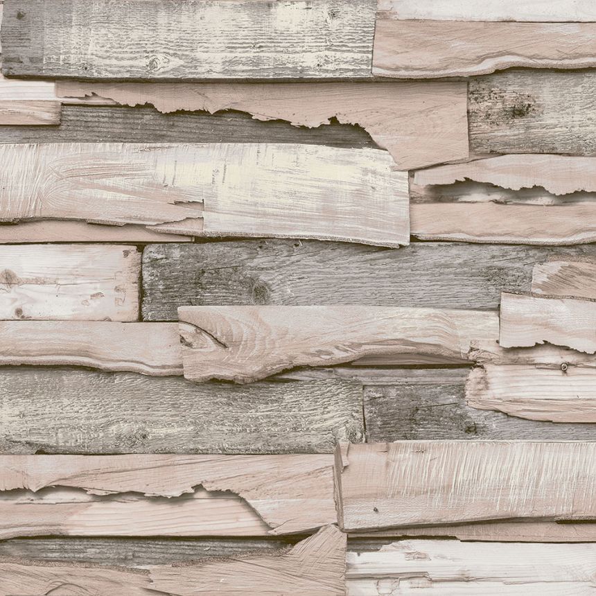Vliesová tapeta na zeď, dekor dřevo, dřevěná prkna, palubky, odstíny přírodní krémové, šedo-hnědé a béžové s nádechem do růžova.