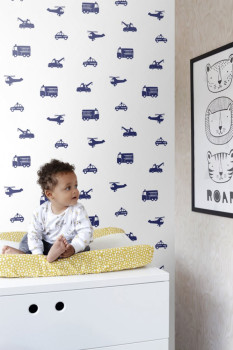 Vliesová tapeta na zeď, tapeta pro kluky, bílý podklad, tmavě modrá auta, jeřáby a vrtulníky.