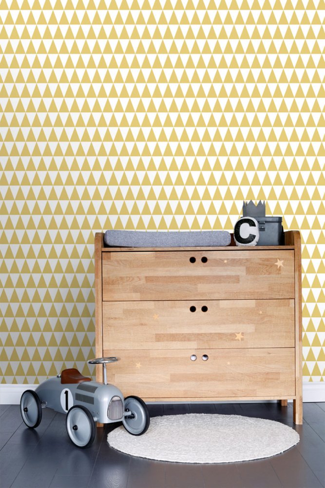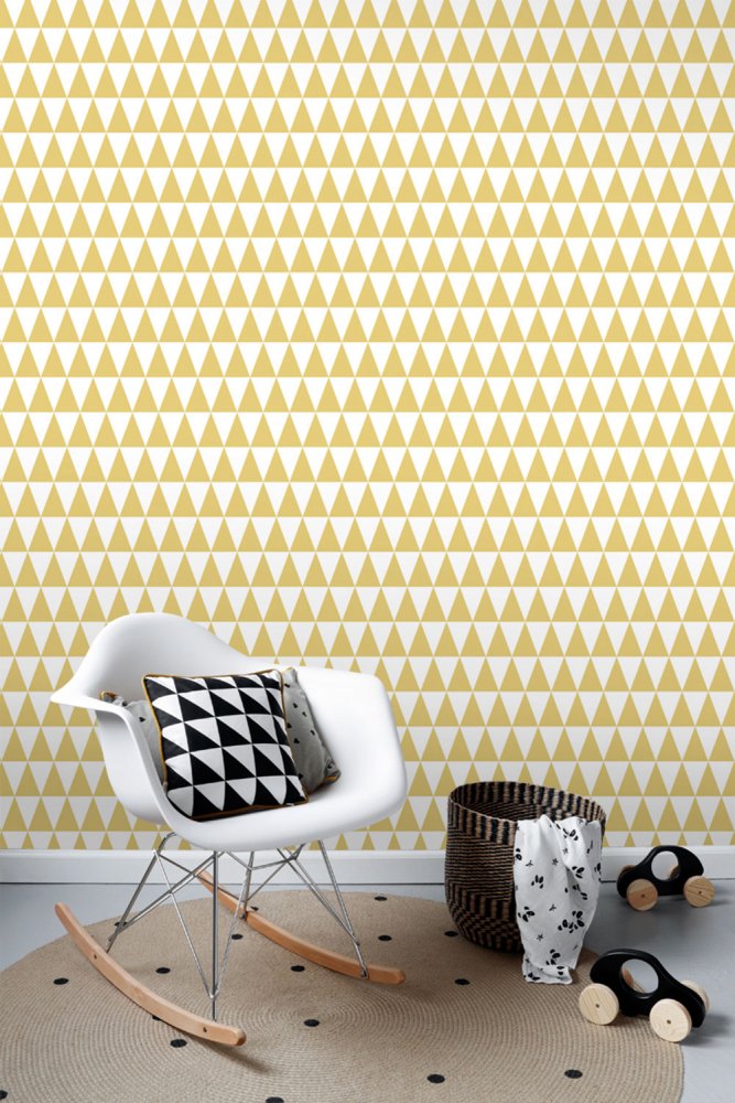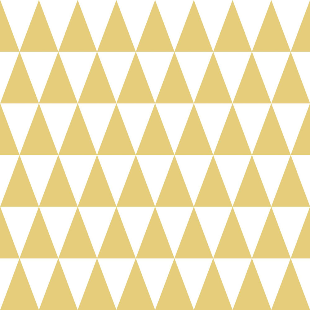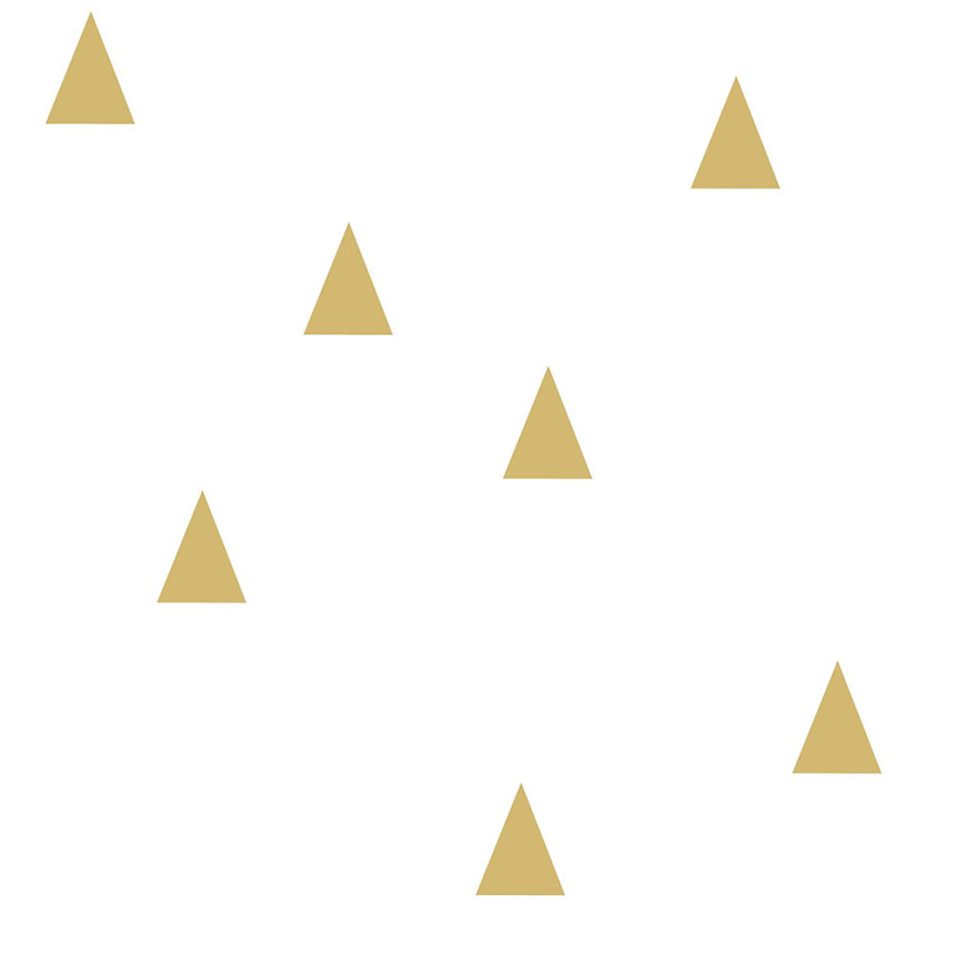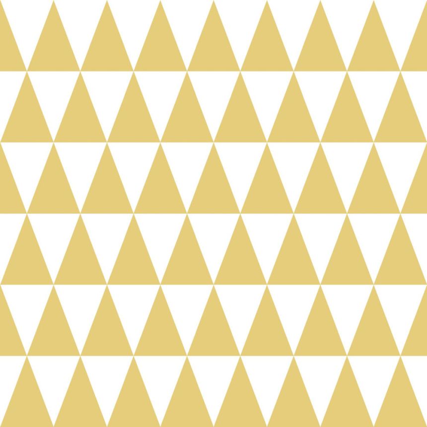 Geometrická vliesová tapeta na zeď, bílé a okrové trojúhelníky.