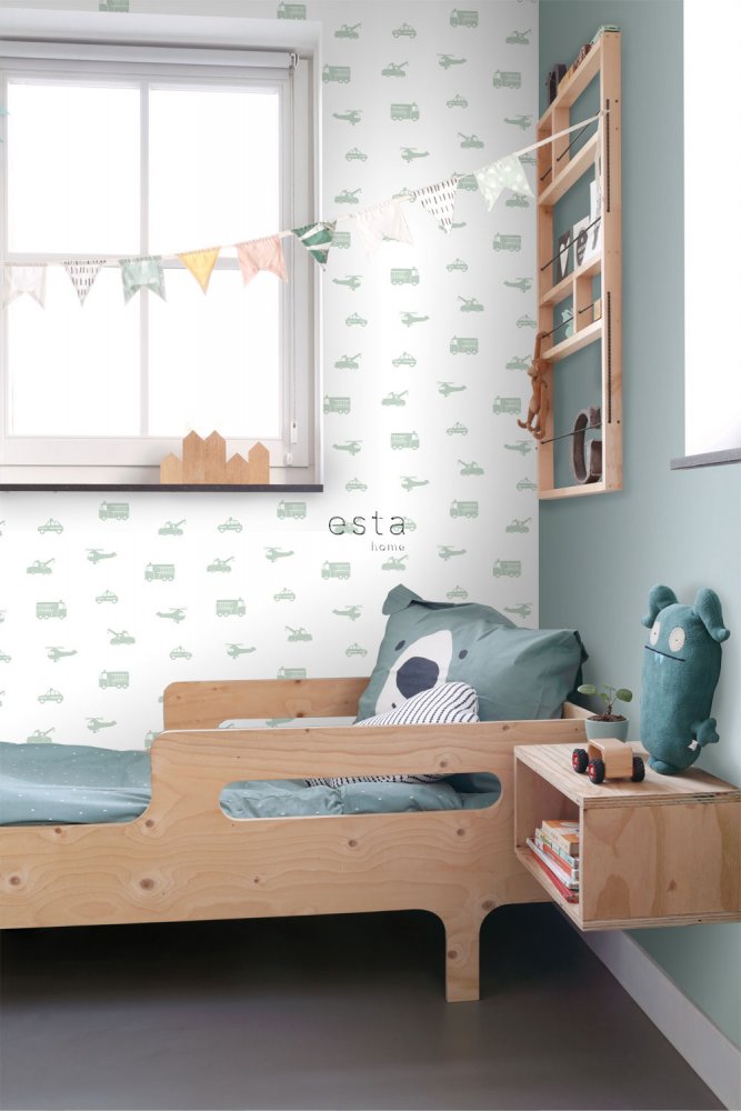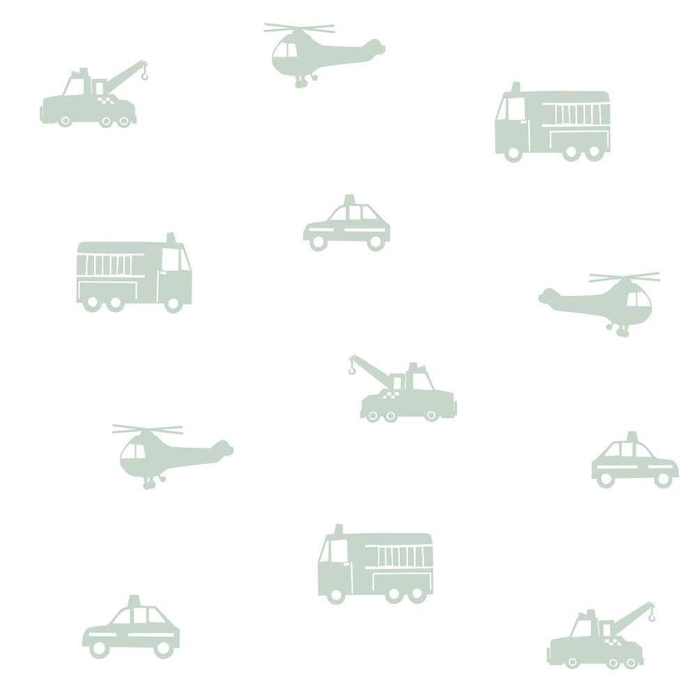 Vliesová tapeta pro kluky, zelená auta, vrtulníky na bílém podkladu.