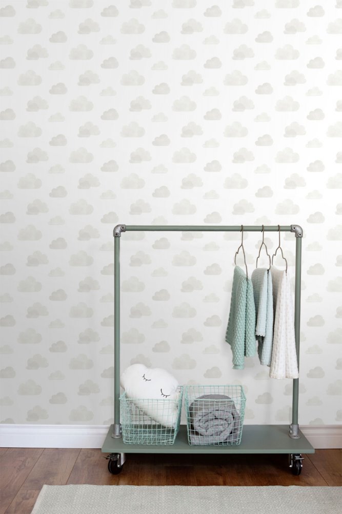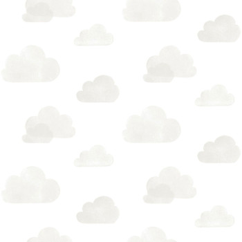 Bílá vliesová tapeta na zeď, šedé mráčky. Tapeta ideální do dětského pokojíčku.