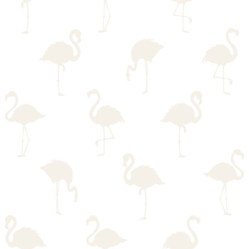 Bílá vliesová tapeta na zeď, plameňáci. Matný bílý podklad, metalický vzor.