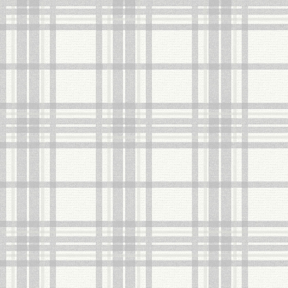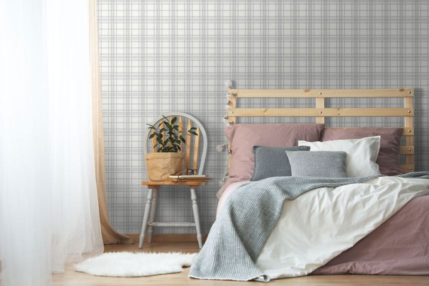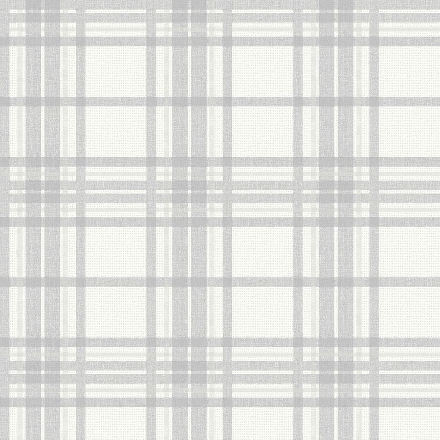 Vliesová tapeta na zeď. Vzor a struktura tartanové tkaniny - odstíny šedé, kovově lesklý stříbrný proužek.