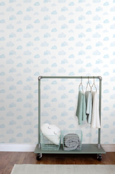 Vliesová dětská tapeta na zeď, světle modré mráčky na bílém podkladu.