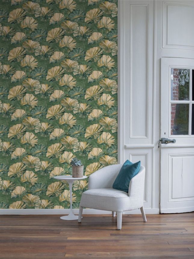 Romantická vliesová tapeta na zeď, květy leknínů na zeleném podkladu.