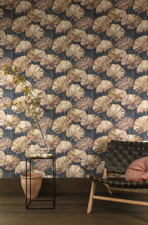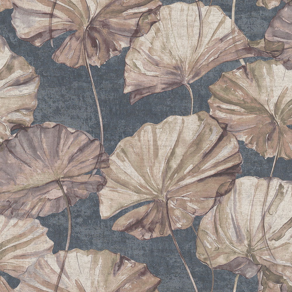Romantická vliesová tapeta na zeď, květy leknínů na modrém podkladu. Květy v odstínech vínové, okrové a růžové.