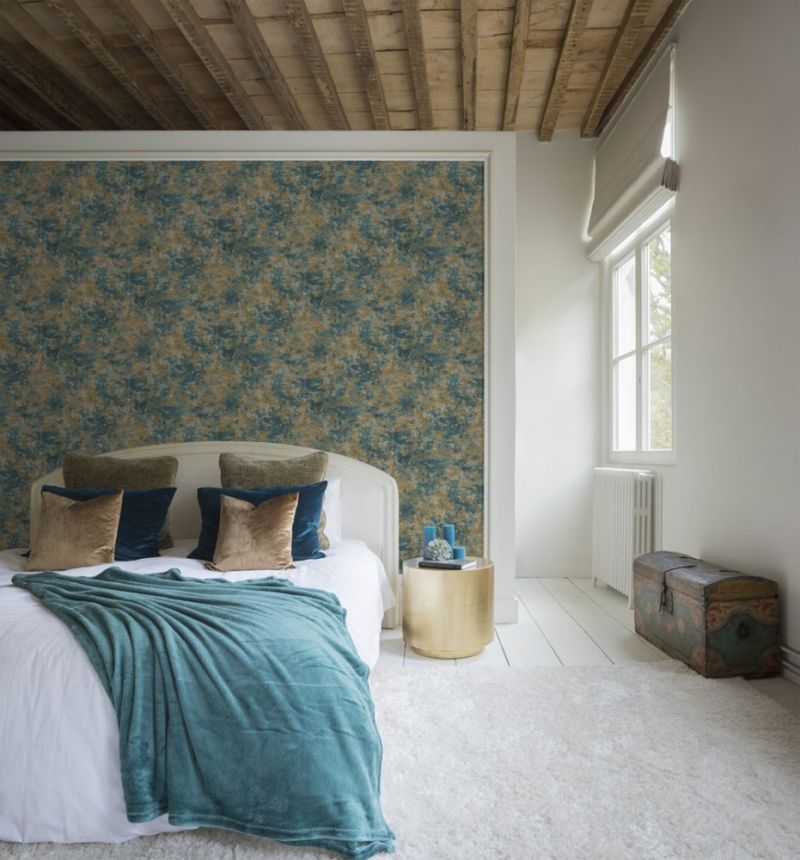 Vliesová tapeta na zeď, beton v odstínech tyrkysové a hnědozlaté.