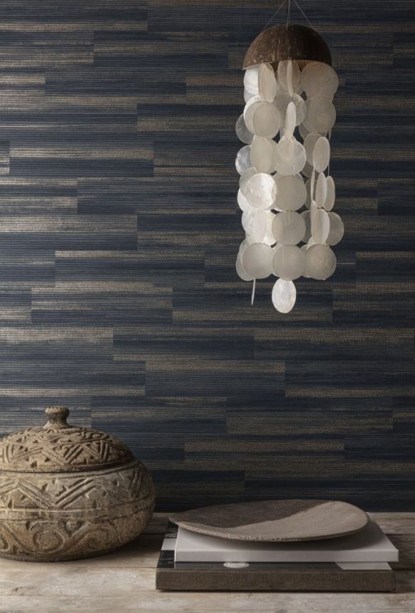 Vliesová tapeta se strukturou rohože, odstíny zelené, modré a zlaté.