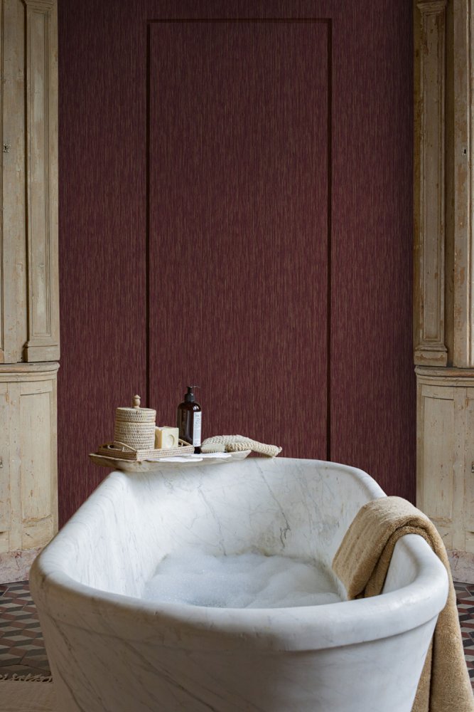 Žíhaná, jemně plastická vínově-zlatá vliesová tapeta na zeď, jemný metalický lesk.