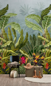Vliesová obrazová tapeta s motivem džungle, s tropickými listy a květinami.