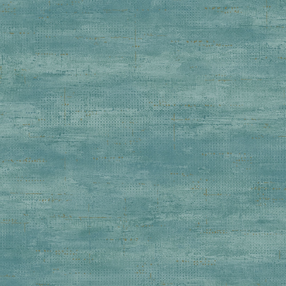 Vliesová tapeta, imitace kovových obkladových desek v odstínech tyrkysové, drobné zlaté detaily.
