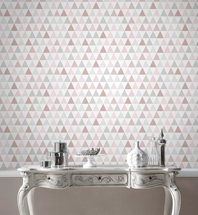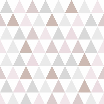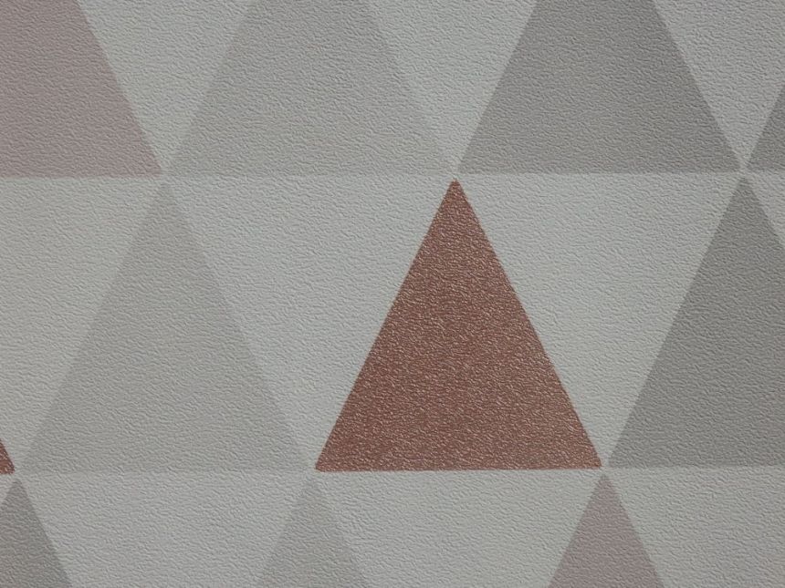 Vliesová tapeta s trojúhelníkovým vzorem v jemných růžových a hnědých metalických odstínech.
