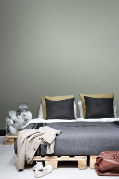 Strukturovaná vliesová tapeta na zeď, imitace šedozelené režné látky.