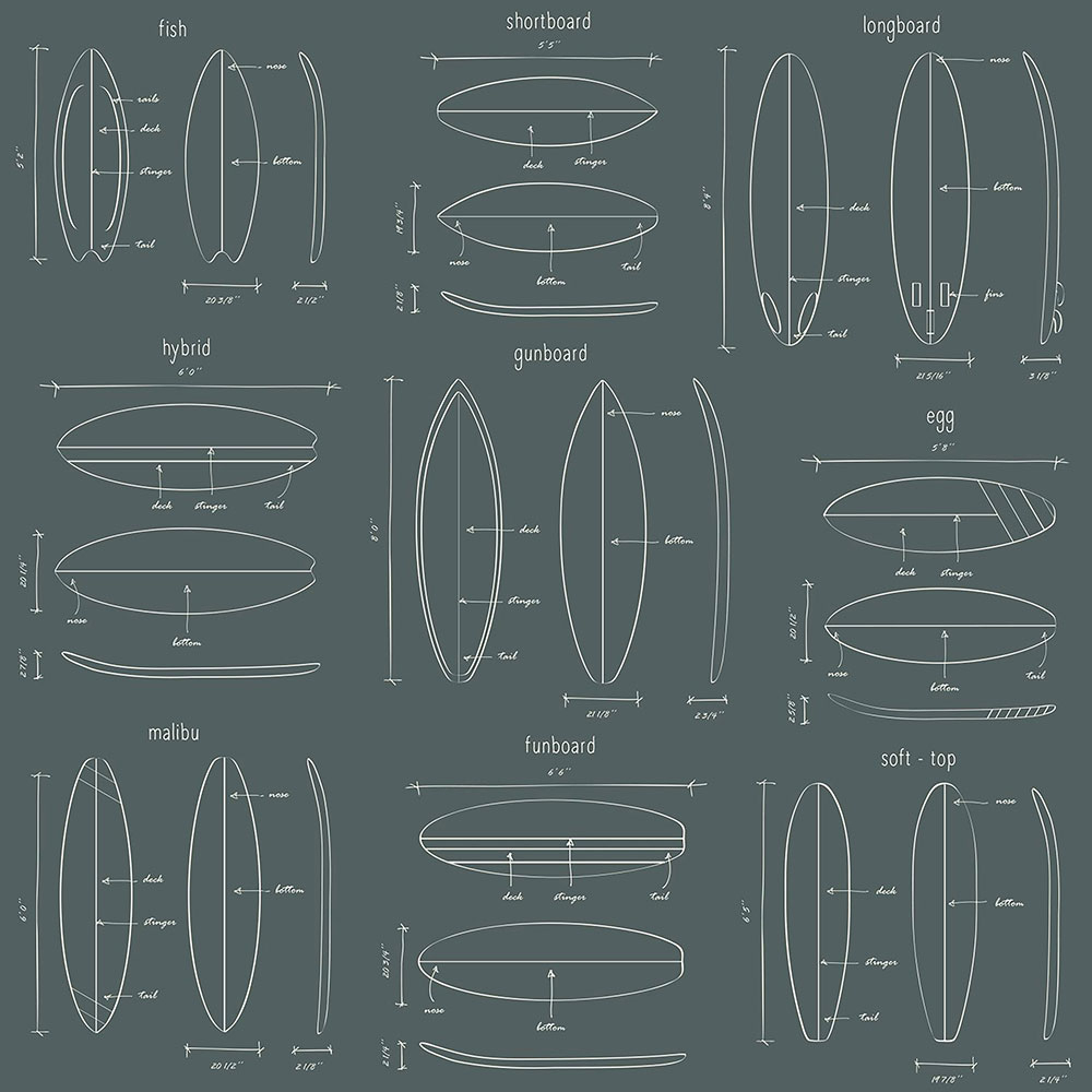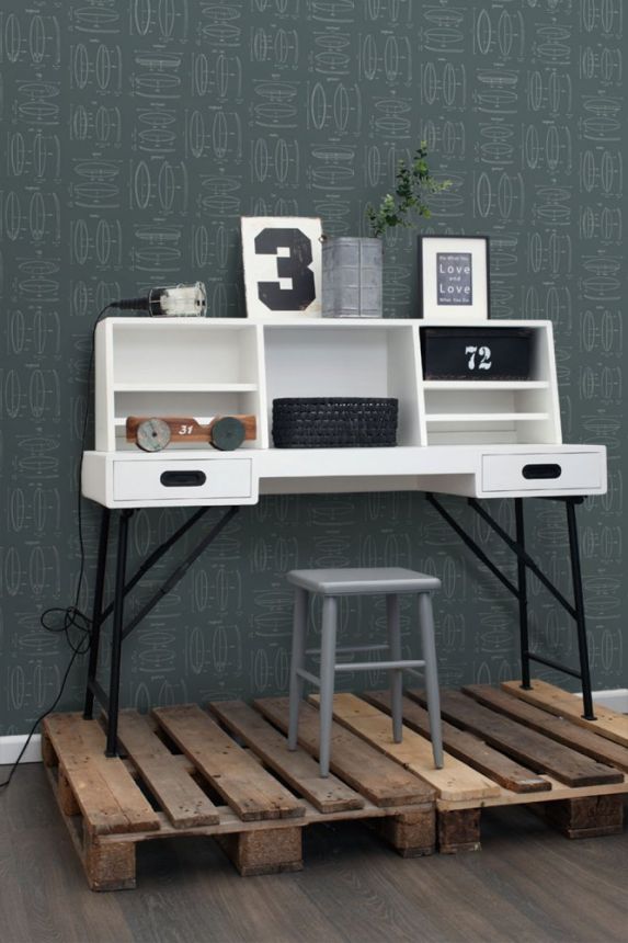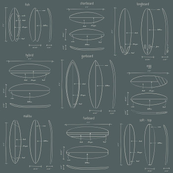 Šedo-zelená vliesová tapeta na zeď, šedé nákresy surfových prken.