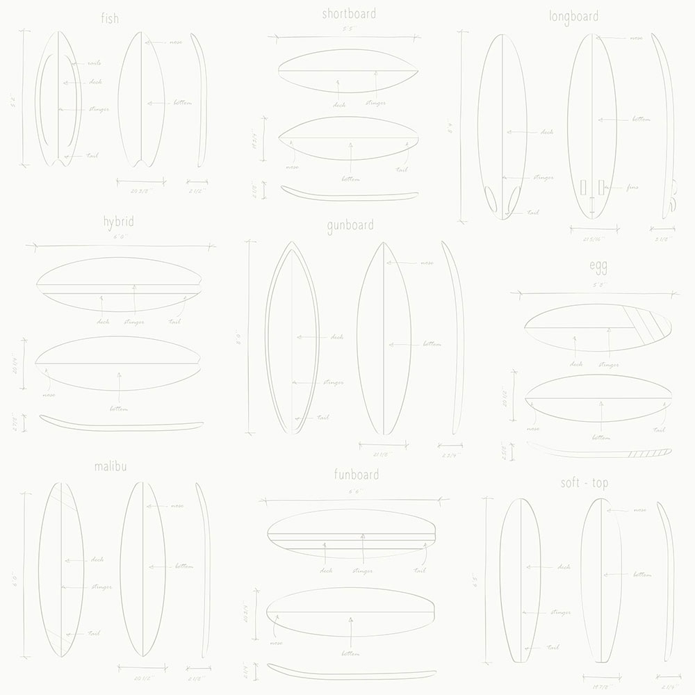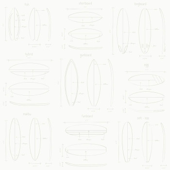 Přírodní vliesová tapeta na zeď, šedé nákresy surfových prken.