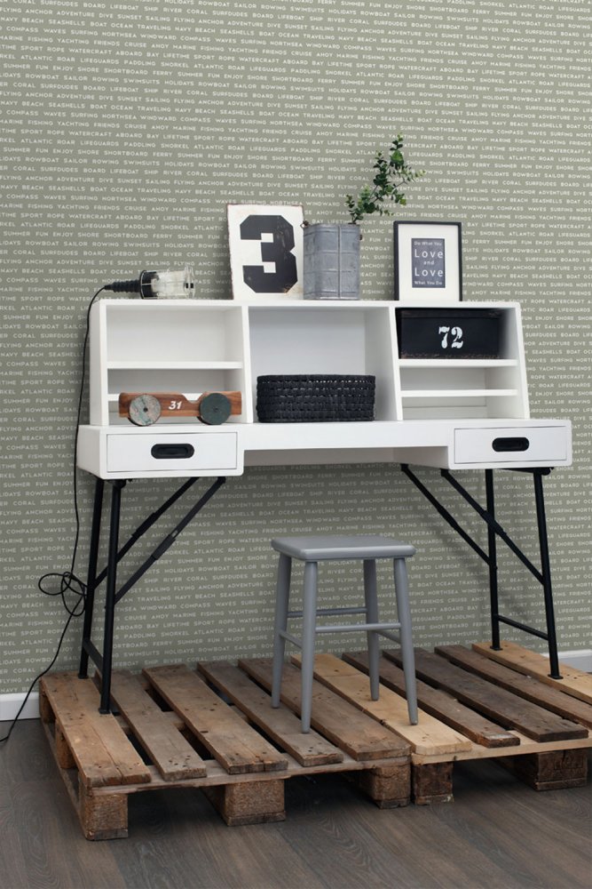 Vliesová tapeta na zeď, šedozelená tapeta s bílými nápisy s námořnickou tématikou.