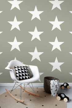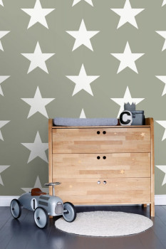Šedo-zelená vliesová tapeta na zeď, bílé hvězdy.