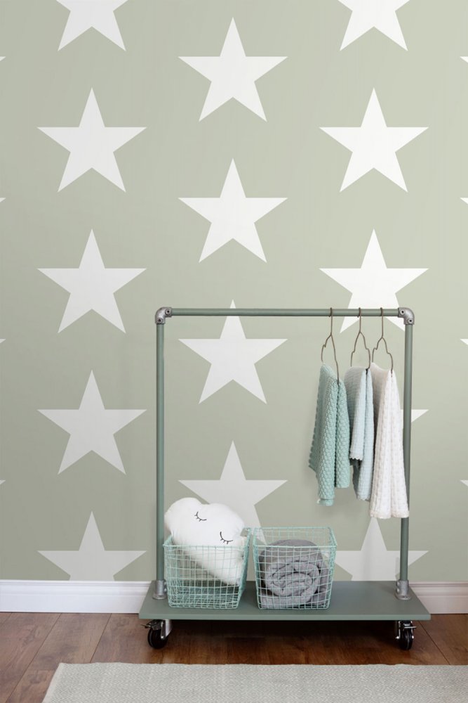 Šedo-zelená vliesová tapeta na zeď, bílé hvězdy.