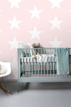 Růžová vliesová tapeta na zeď, bílé hvězdy.