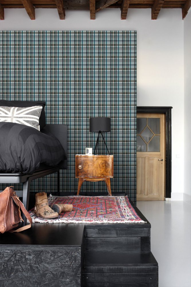 Vliesová tapeta na zeď, vzor káro v odstínech zelené, šedé a černé.