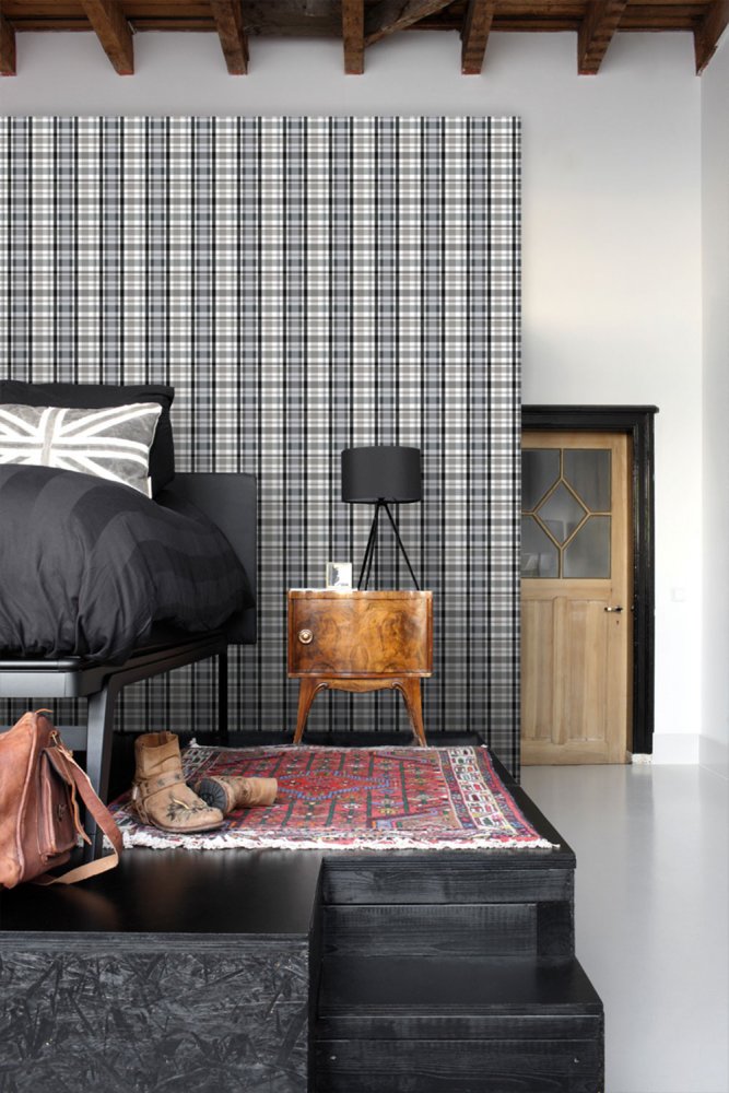 Vliesová tapeta na zeď, vzor káro v odstínech šedé, černé a bílé.