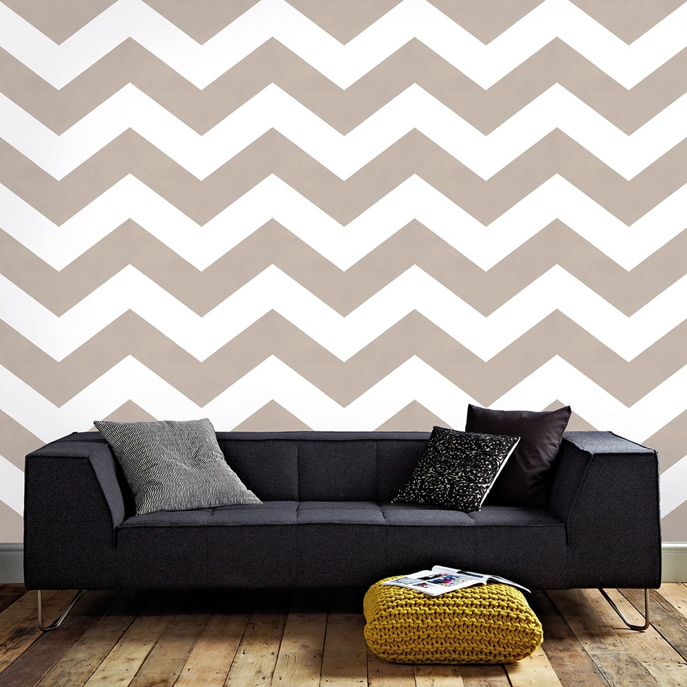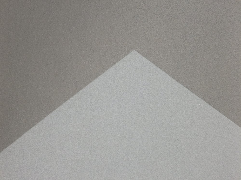 Moderní geometrický vzor v šedo-béžových odstínech na bílé vliesové tapetě.