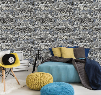 Šedomodrá vliesová tapeta s graffity, tapeta nejen pro teenagery.