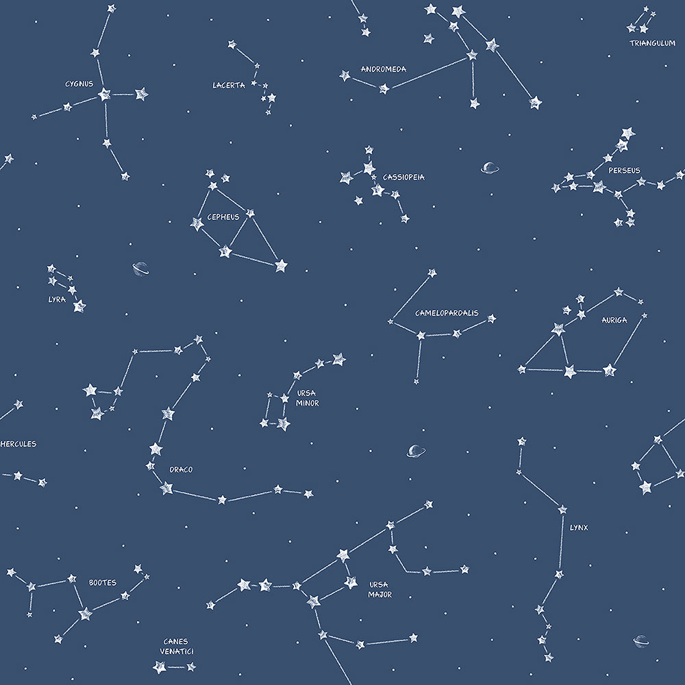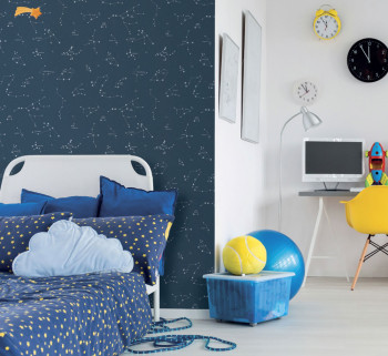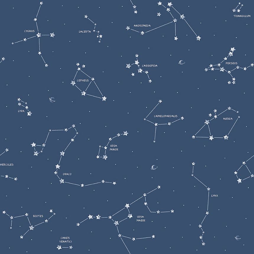 Tmavě modrá papírová tapeta na zeď, souhvězdí.