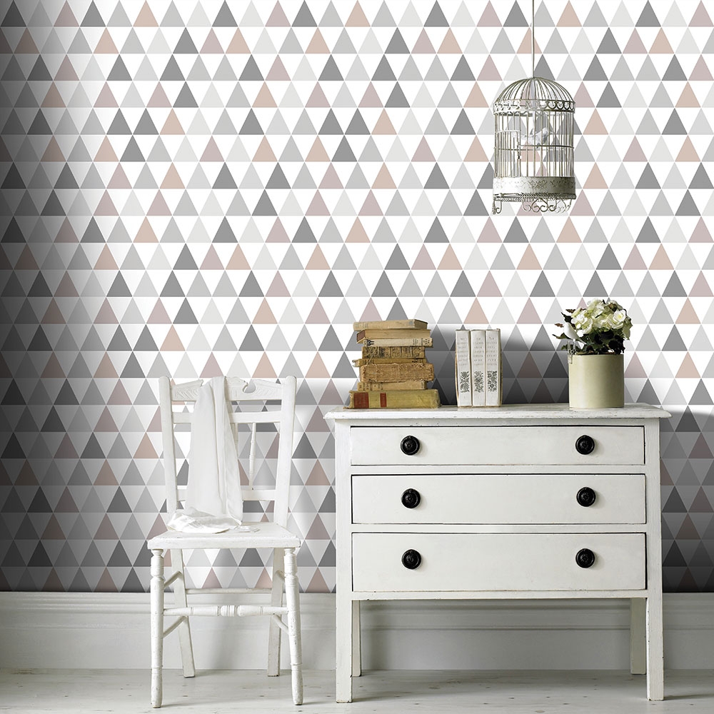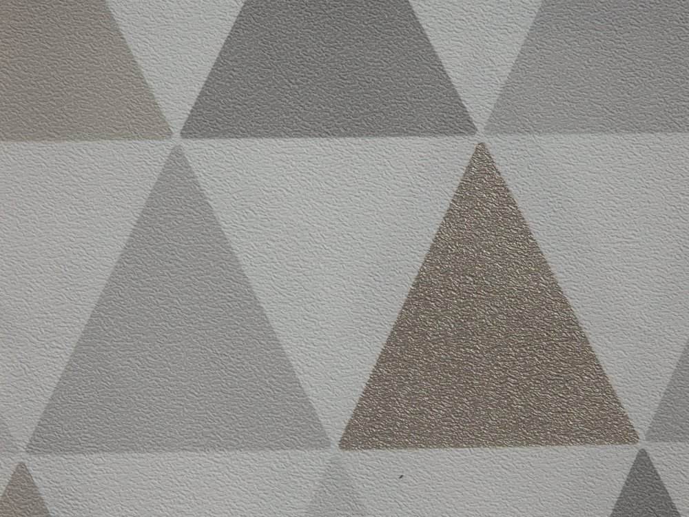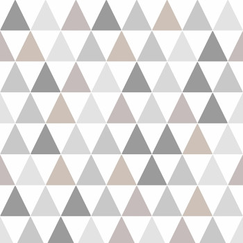 Moderní trojúhelníková mozaika v odstínech šedé a béžové na bílé vliesové tapetě.