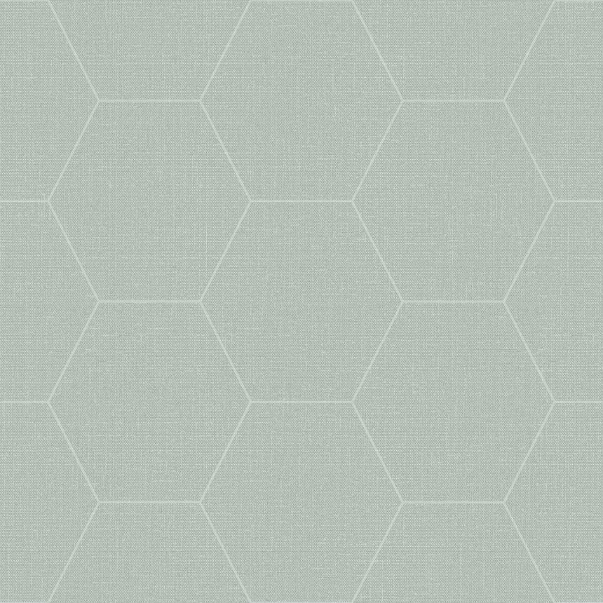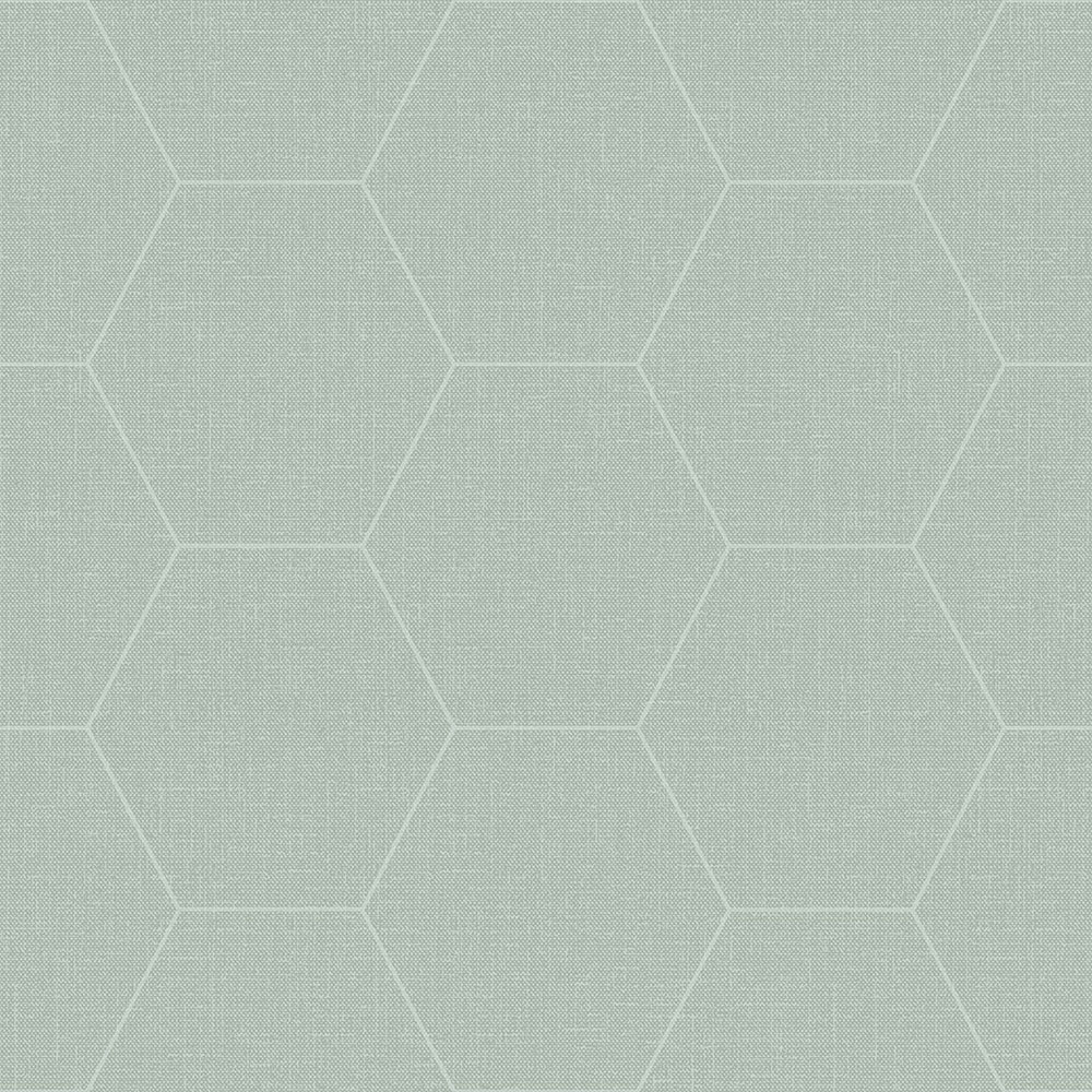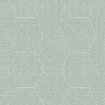 Geometrická vliesová tapeta s látkovou texturou, obrysy hexagonů, melanž zelené a šedo-zelené.