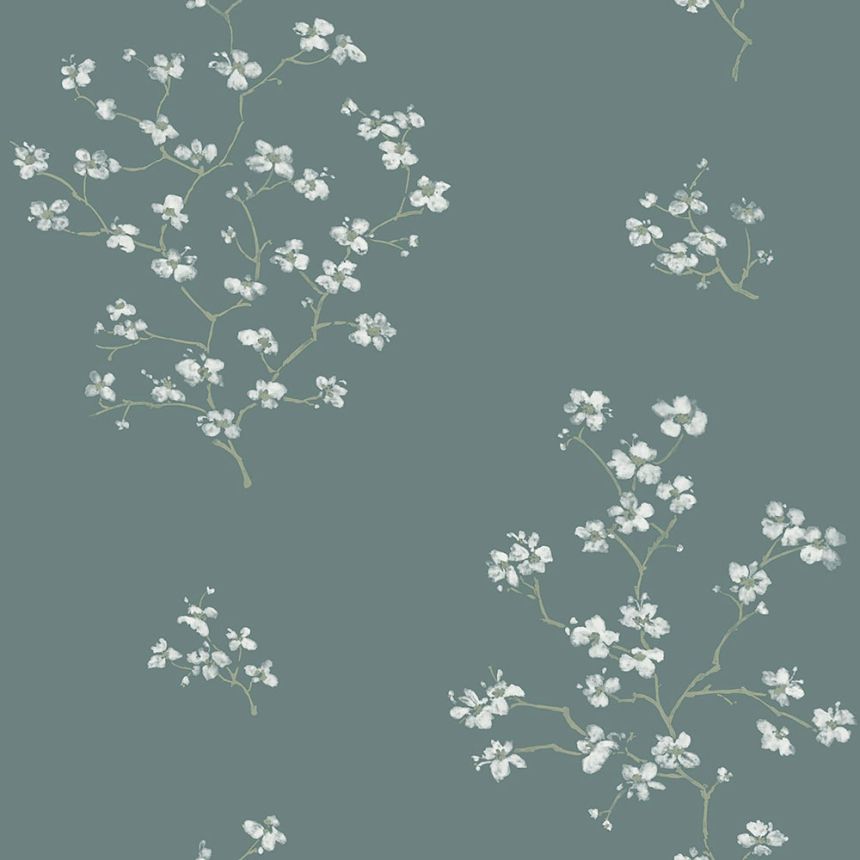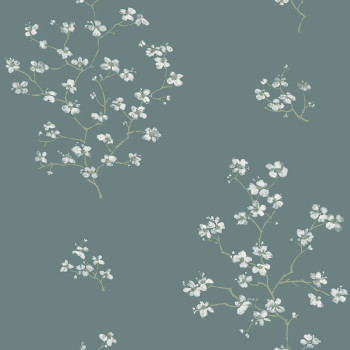 Modro-zelená vliesová tapeta na zeď, rozvetlé větvičky třešně.