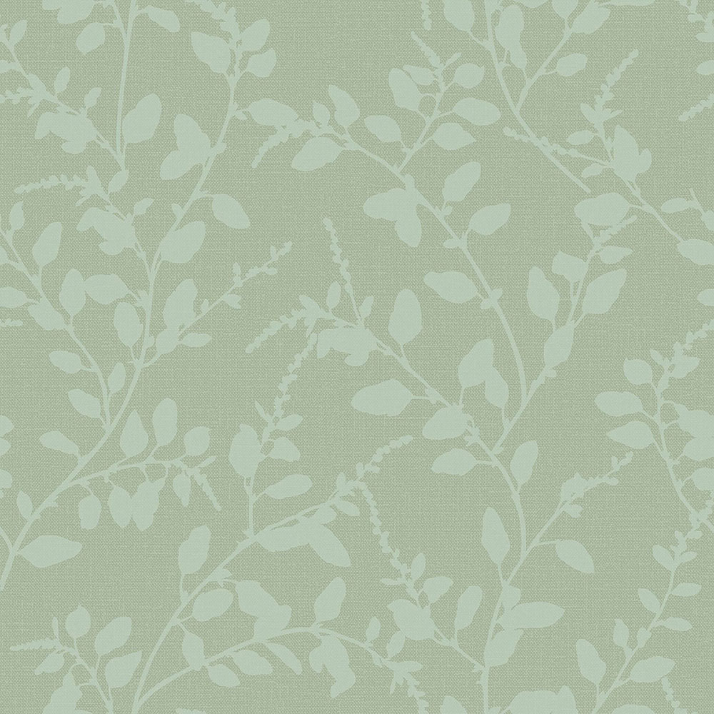 Vliesová tapeta na zeď, motiv listů a větviček, tapeta má látkovou texturu, odstíny zelené.