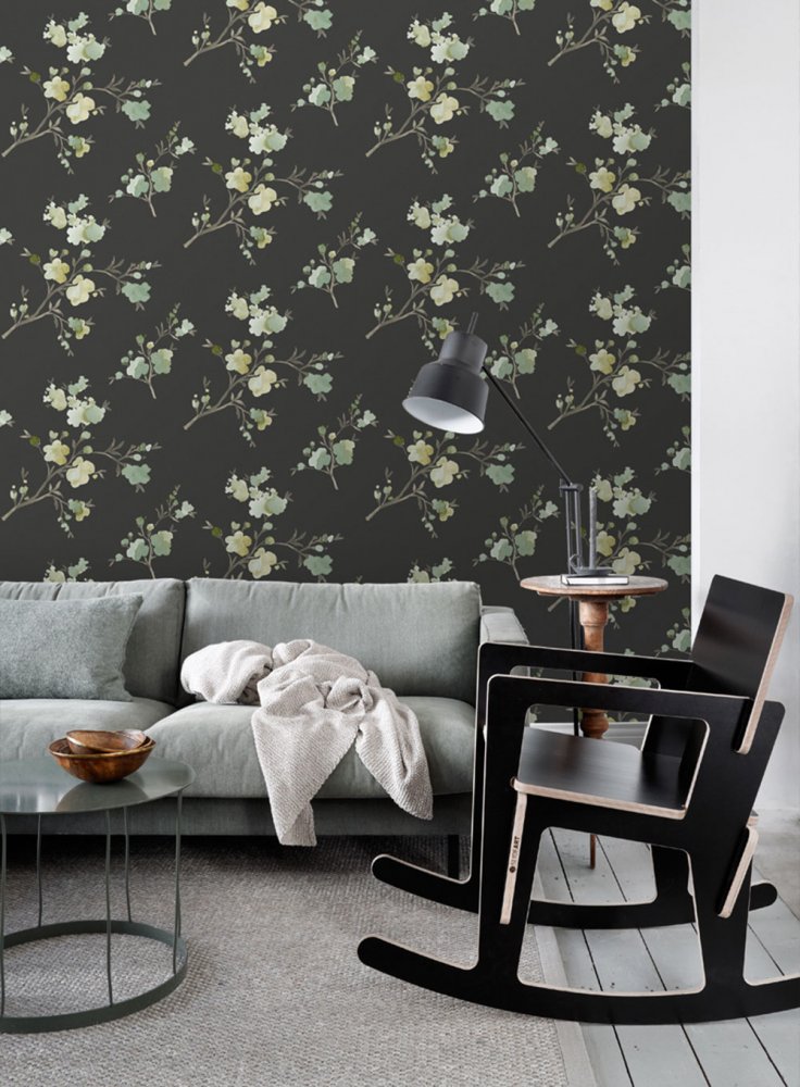 Černá vliesová tapeta na zeď, motiv malby rozkvetlých větviček, tapeta má látkovou texturu.
